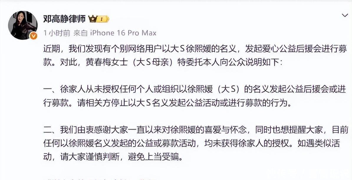 真是气不打一处来!大 S 走了才多久啊,某些人就开始吃“人血馒头”了?具俊晔前脚刚回韩国平复心情,后脚就有人打着大 S 的旗号搞募捐骗钱,简直是把逝者当提款机!S 妈黄春梅本来就被丧女之痛折磨得够呛,还得替女儿挡这些脏水,换谁谁能忍?好在邓高静律师终于爆了,直接发声明怒斥:徐家从来没授权过任何人搞什么公益募捐!